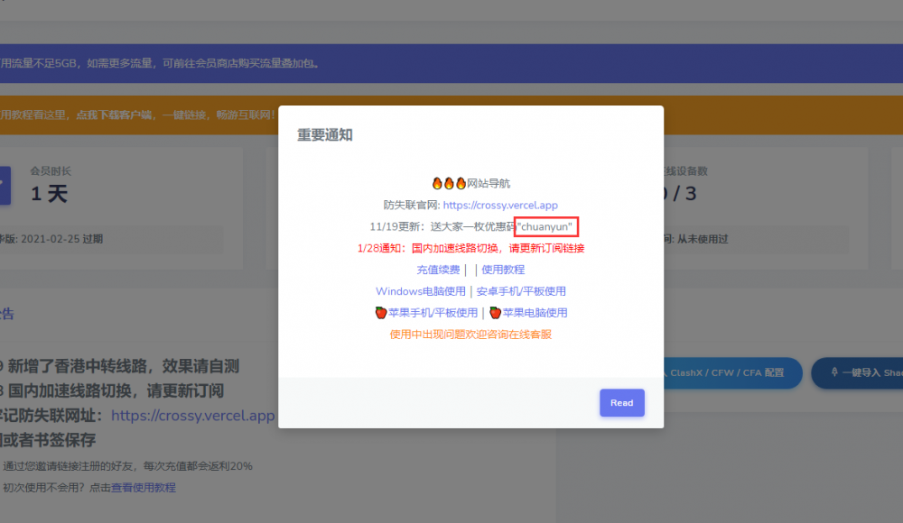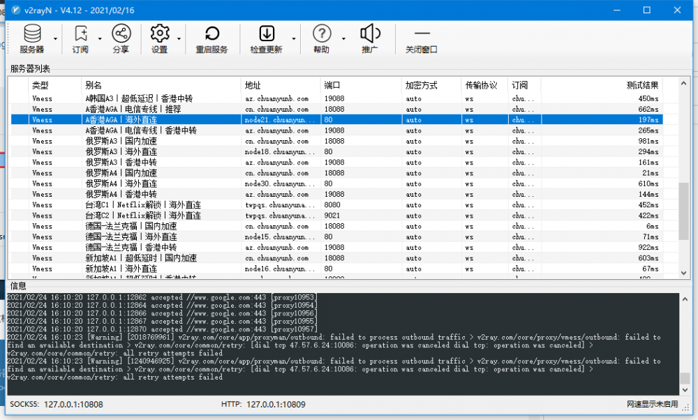 从EVE官方网页改版,注册需要GOOGLE验证码后,我们就要开始学习如何代理浏览器能够正常的访问GOOGLE,也是对上个教程的再拓展,更全面的教程让大家不仅能够方便的游戏,还可以科学上网。 涉及的工具和软件 代理的方式有3钟,是4个工具的相互组合或者单独使用,会写出相应的功能以及优劣 3种方式如下: v2rayN(不支持代理游戏,支持代理浏览器) SockCap64 + v2rayN(支持代理游戏,每次需要先启动Sockcap64,再从中启动游戏,不支持代理浏览器,支持通过v2rayN自动切换节点)(推荐) Proxifier + v2rayN(支持代理游戏,后台运行Proxifier即可,可自启动,支持代理浏览器,支持通过v2rayN自动切换节点)(使用其他加速器时如UU,则不推荐) 可视化图表,更方便大家进行选择: 方式 支持代理浏览器 支持代理游戏 支持自动切换节点 v2rayN √ × √ SockCap64 + v2rayN × √ √ Proxifier + v2rayN √ √ √ 还有一些工具,Shadowrocket等工具,可以自行研究 请根据自身需求,来选择合适的代理方式,更好的代理方式,需要更复杂的设置流程,当然我们也会在下面的教程中,详细写出每一步步骤。 准备代理服务器 无论使用哪种方式,准备一个代理服务器,是必须的,你可以购买,或者自己搭建,我现在使用的一个代理服务器就不错。 注册账号 如果不介意的话,可以点击下面的分享链接 飞木鱼:http://chuanyun.live/auth/register?code=NkSy 穿云半跑路可以考虑这个:https://naiko.cloud/auth/register?code=YXGo,操作基本一致 首先点击上面这个链接,会进入穿云的注册页面 填写必要的信息后,点击【注册】 请注意公告,有时候会送你一个优惠码,之后在购买的时候能够使用 新用户会赠送你1天的使用市场,3gb流量,足够你体验一下 如果你在想先试用的话,可以跳过下面的购买套餐,根据之后的使用教程体验后,觉得不错,再进行购买 购买套餐 点击【购买套餐】,可以根据自己的需求进行选择,一般玩游戏的话,选择18套餐即可,允许3个IP在线,也就是说同一WIFI下,多个设备登录,算一个IP,那么你完全可以和2-4个人拼车,较少支出,毕竟同WIFI下算一个IP,也不一定同时上线,我白天上youtube,你晚上看片,互不影响。 购买时记得点击左下角的优惠码,进行优惠 比如我填写 chuanyun 后,就可以优惠一点点钱 购买套餐后,你就可以在首页看到你的套餐了 v2RayN v2RayN这个工具,是对代理最基础的使用,你可以https://github.com/2dust/v2rayN/releases 下载,2个zip都要下载,也可以从群文件下载 然后将2个压缩包解压,放到同一个文件夹下即可,比如我这里就把它们都放到v2rayN这个文件夹下,然后直接运行v2rayN.exe即可 然后打开购买的代理的网站【首页】,【复制V2Ray订阅链接】 点击后,会给你提示【已复制】 接下来,我们来打开v2rayN的界面,选择【订阅-订阅设置】 然后选择【添加】按钮,把刚才的v2ray订阅链接粘贴进去,点击确定按钮 接下来选择【订阅-更新订阅】,当你觉得服务器有问题,或者节点多个链接有问题,请重复此操作,可能是订阅的服务器更新了 更新完毕后,就可以看到一堆的服务器已经获取了 这里我们要选择最快的一个服务器,通过【ctrl+a】全选所有服务器 然后【ctrl+r】,会ping google,进行延迟检测 选择延迟较低的服务器,比如我看【A香港AGA】比错,我就选择上该服务器,然后【enter】,设置为活动服务器,设置完毕后,会重启服务,可以看到该页面 点击【设置-路由设置】 将几个窗口填写为以下内容 或者直接选择【一键导入基础规则】,即可自动填写规则 你可以根据自己的需求,添加规则,最后点击【确定】重启服务即可 然后在右下角,圆形V右键,选择【系统代理-自动配置系统代理】 这样你就就成功代理浏览器了 然后根据自己需求,选择是否在设置打开【开机自动启动】 SockCap64 + v2ray 首先要保证您已经成功配置好v2ray,以及安装好SockCap64 打开安装好的SocksCap,选择代理按钮 然后直接手动添加一个节点,这个节点是ShadowsocksR的默认端口,如果你修改了,这里你需要自己修改,127.0.0.1,端口10808,代理类型Socks5,注意端口请根据v2ray的端口来设置,应该是10808 添加完后点保存,然后把eve图标拖进来,双击运行即可 这样配置的SockCap64,可以通过ShadowsocksR的自切换节点,每次启动就不需要自己手动来切换节点了。 Proxifier + v2ray Proxifier可以百度上搜索下载,这里我就不提供了 打开安装好后Proxifier 点配置文件→代理服务器→添加 如下图,注意端口请根据v2ray的端口来设置,应该是10808 之后一路点确定,注意这个页面确定在这里 点配置文件→代理规则→添加 如下图 复制内容: exefile.exe;eve.exe;updater.exe;LogLite.exe;evelauncher.exe;fixpermissions.exe;LogServer.exe;rescache.exe;eveBanner.exe;ccpBrowser.exe;DirectXRedist.exe;LogServer.exe;maintenancetool.exe;QtWebEngineProcess.exe 到应用程序那里,然后,动作那里选择刚才的那个代理 然后到这个界面时注意编辑default规则为“direct” 否则网速会变慢! 然后点确定,你同样可以在文件里面选择自动打开,这样子每次开机就不需要手动启动了,直接运行游戏,如果在Proxifier看到一堆链接就表示代理成功了 proxifier你可以设置成后台运行,代理规则那里你可以添加任意程序,包括浏览器,都可以代理