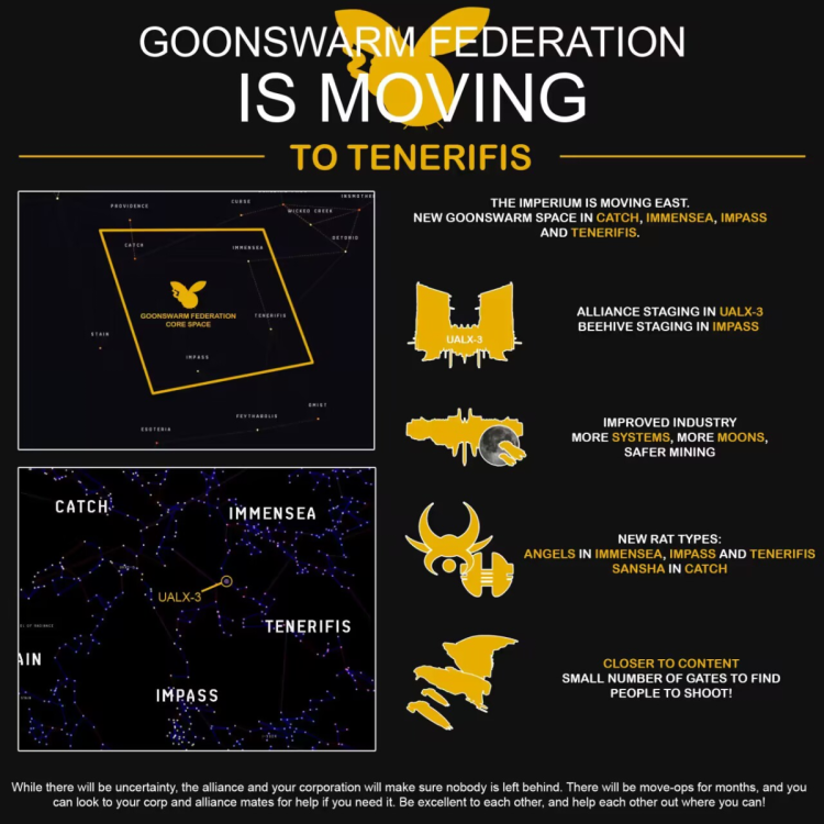 联盟搬家公告以及安排----2024年10月14日更新版本 一、联盟新首都:位于特里菲斯的 UALX-3 - 1st Byzantigoon 二、蜜蜂新的地盘安排 东卡彻,整个伊梅,整个绝经,西特里菲斯,未来大概会在绝经的Y-JKJ8起黑隐伞。未来会有更多的星系刷怪、挖矿,也会有更多的月矿。伊梅和绝经和特里菲斯是天使怪,卡彻是萨沙怪。总之蜜蜂的IHUB的地盘都可以生产,目前绝经在等待联盟一周后入住以后会陆续的扔IHUB。之后联盟会在新的地盘下3倍于绝地的建筑! 下面图中标注CONDI的都是我们的地盘! 三、绝地、贝斯、求瑞思的地盘安排 从下图可以看到,北绝地给了BRAVE,南绝地和贝斯给了DC,西绝地给了INIT,求瑞思给了IGC和LAWN。 四、我们的搬家安排: 1,所有常规战斗船:跟联盟或者军团的移动舰队全部去UALX 2,所有旗舰: (1)所有在1DQ1的旗舰(包括大航、泰坦、大鱼)跳去49-U6U,星城诱导链是: 1DQ1 ~ PUIG-F ~ 49-U6U。到达49以后,不要自己过4-07的门,看旗舰群通知,与联盟大舰队一起过门,联盟会在一周内组织大量舰队让你安全过门,之后会有大量的诱导舰队带你到UALX来,时间大概是在2024年10月19日开始。 (2)所有已经在4-07的旗舰(包括大航、泰坦、大鱼)可以自己开诱导去UALX,星城诱导链是: 4-07MU ~ EX6-AO ~ SNFV-I ~ OGL8-Q ~ UALX-3 (3)所有在U-Q的旗舰(包括大航、泰坦、大鱼)跳去UALX,星城链是:U-QVWD ~ OGL8-Q ~ UALX-3 3,散落在全绝地的物资,首先全部集中到1DQ1星城,有3种方法进行处理: (1)通过ITL联盟运输运到UALX,1dq去ualx 运费950isk/m3, 包船35万立方是325m。ITL的公司名字是Imperial Transcontinental Logistics ,计算运费的网站是:https://www.imperialtranscontinentallogistics.com/#!/page/get_route_calculator (2)通过ITL联盟运输运到JITA出售,1dq去jita运费850isk/m3, 包船35万立方是290m。 (3)卖给RUB AND STUB BUYBACK SERVICE这个公司,他们现在在绝地只在1DQ1收垃圾,求瑞思在P-ZM收垃圾,特里菲斯在UALX收垃圾。什么东西什么价格收去看他们的帖子https://goonfleet.com/index.php/topic/209772-buyback-service-of-mostly-anything-the-firm-rub-og-stub/?hl=rub+and+stub或者DISCORD频道https://discord.gg/qv6qSSAAXw置顶的介绍,基本上都是吉他买价96折,你可以使用网站估算好价格之后,使用估价网站的时候复制物品名字需要使用英文客户端!带价格挂给这个公司,在合同描述里面带着估算的链接,估价网站是:https://appraise.gnf.lt/ 4,在U-Q的常规,跟联盟或者军团的移动舰队全部去UALX。 5,在U-Q的物资,通过ITL联盟运输运到UALX,u-q去ualx 运费100isk/m3, 包船35万立方是50m。 6,之前要求大家准备的免费猛鬼号在CAD公司的那个,全部留在绝地不要动先。 7,如果你有自己的跳货,可以使用以下路线来移动你的跳货:https://evemaps.dotlan.net/jump/Ark,544/1DQ1-A:T8T-RA:0TKF-6:NRT4-U:EX6-AO:U-QVWD:UALX-3 8,联盟会拔掉大部分绝地、贝斯、求瑞思的建筑,每个星系大概会留下一个中型的建筑来为你们收集安全资产,目前绝地的建筑正在大量的解铆。 五、其他一些须知 1,Jabber开了新频道moving,为互相帮助而设,你可以提供旗舰运力给需要的人,或者在这里请求帮助 2,绝地的固定诱导明灯已经关了,不要过门,不要在1DQ的不同星城之间来回运细软,1DQ皇宫不会解锚,UALX到49U的星城链不会消失 3,旗舰移动可以申请油费 4,新的领地只有UALX一个市场 5,联盟会研究新的领地超旗刷怪的可行性 6,新领地可以放POS,如果你需要在哪个星系需要POS,请与军团管理联系给你插POS。 六,最重要的一点,去私聊你们军团的AFK的老玩家,让AFK玩家抓紧回归,跟上步伐一起搬家离开绝地去新的家!