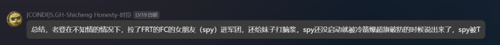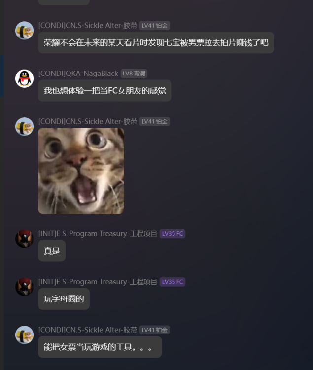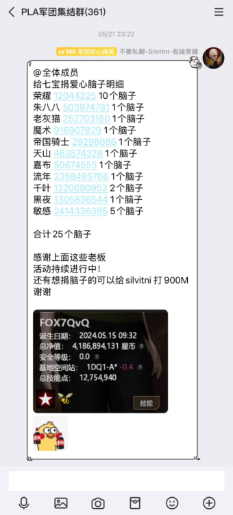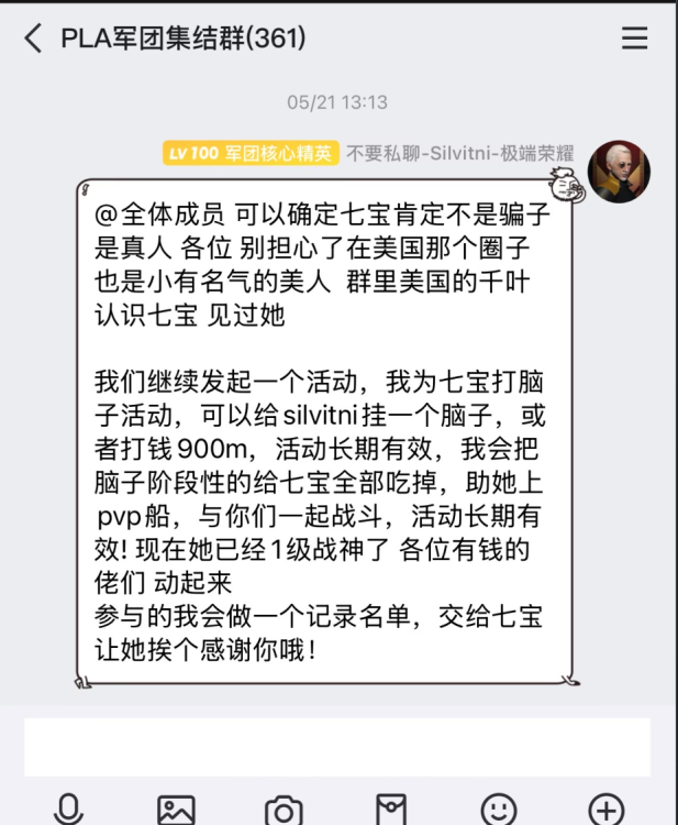 一、七宝的加入 2024年5月19日,我们突然发现高安QQ群有一个女玩家,她的QQ号码是826239032,她的抖音号是berryhunter,这可以从QQ上面直接看到,抖音昵称叫做暴走一只狐狸,游戏ID是FOX7QvQ 和 FOX77QvQ 女玩家在EVE来说是很罕见的存在,可以提升语音人气度,于是我把这个七宝拉过来加了PLA的00军团。 二、关于捐脑浆事件 1.我希望她快点能上手玩起来EVE,可以快速的升升打架技能,可以一起跟队玩耍,体验EVE战斗的场景,于是我动员了团员以及我自己也给了她一些脑子。一共合计捐了25个脑子,价值是225亿的样子,然后把她的号打到了1200多万。 2.因为军团群里有马甲,FRT很快就知道了这个消息,各路黑子,喷子,这个时候就开始集体高潮了,说我荣耀是舔狗,众筹脑子给女团员吃脑子,这个那个。以咪咪,copo蜀道山等等乱七八糟的小垃圾人,加了七宝的QQ,对七宝进行各种的骚扰,甚至也有开始对七宝进行人身攻击的,还有造谣七宝照片不是本人的,说她是骗子,是澳洲的等等,导致七宝情绪失控了,七宝就开始加入了凛冬新闻群,对FRT的人开启了群攻模式。以下是一些各种黑子的截图,请大家欣赏。 上面是七宝骂咪咪的话 3.让他们这么一闹腾,我也有点嘀咕了,不会真是来骗钱的吧,但是!我们军团有一名在美国的成员叫做千叶,他竟然和这个七宝的同学,认识七宝,并且互相有微信,那我就选择了相信。在确认是真人,不是骗子,是团内同学的情况下,我们进行了脑子捐助! 三、FRT这时候集体全面高潮,我顺势在贴吧发了一贴,关于我是舔狗这件事的报道,我作为CEO,也没做任何过分的事情,我只是给一个身在美国的女EVE玩家一些脑子帮助她快速上手游戏,这怎么了,有什么黑点吗?没有任何的黑点!事情慢慢就这样平息了下去。 四,出现了终极反转! 就在2024年12月25日圣诞节这一天,冷箭在2024年11月29日死亡了天使泰坦和归魂者之后,心智已经完全到了不平衡的水准,喷人毫无攻击力可言,不得已,实在挽回不了颜面的他竟然说出了一个惊天的大秘密,七宝其实是FRT某指挥官的女朋友!加入PLA实际上就是想专门来挖PLA的黑点来了!结果呢?一无所获!冷箭真是个当婊子又立牌坊的大傻逼,嘴上说着不想拿别人的隐私来当谈资,却句句不离别人的隐私,两面人!十足的蠢货。 五、补上冷箭的专题 六、七宝已经被我踢出军团,现在对这件事做一个总结,这件事从开始就是FRT的指挥官用他的女朋友打窝,送到PLA这边来刺探情报或者骗钱或者找PLA军团或者我的黑点,这件事从开始到最后都是一个阴谋,用自己女朋友献身让全体FRT来骂来被骚扰取得我的信任,这戏码真的太足了!可惜被冷箭的那张破嘴给破坏了,到最后FRT也没有找到任何的我的黑点,我只想对你们说这真是太遗憾了。此事到此为止,告你妈辞! 七,后附一些吃瓜群众的评论 后面还有后续啊,和着就是这个大傻逼拿自己女朋友打窝啊,十足的NTR剧情啊,字母圈? 怎么还有后续啊,FRT害怕了,把我踢群了。笑死,老子他妈的玩死你!