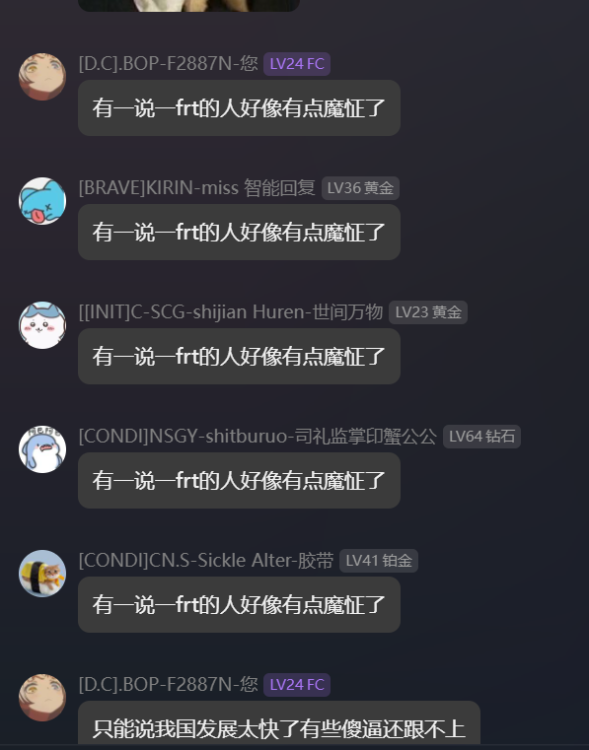 FRT联盟七大臭傻逼 第一名:Nirvoak Denullth 第二名:Gary CHGS 第三名:Cyncia Geass 第四名:bingbing Audeles 第五名:Jack Durant 第六名:FlyingBee 第七名:Reiko Hita
