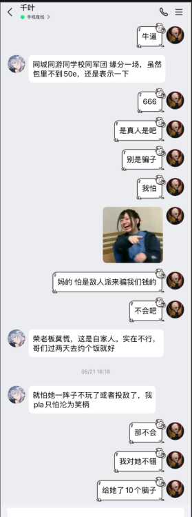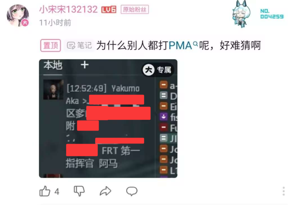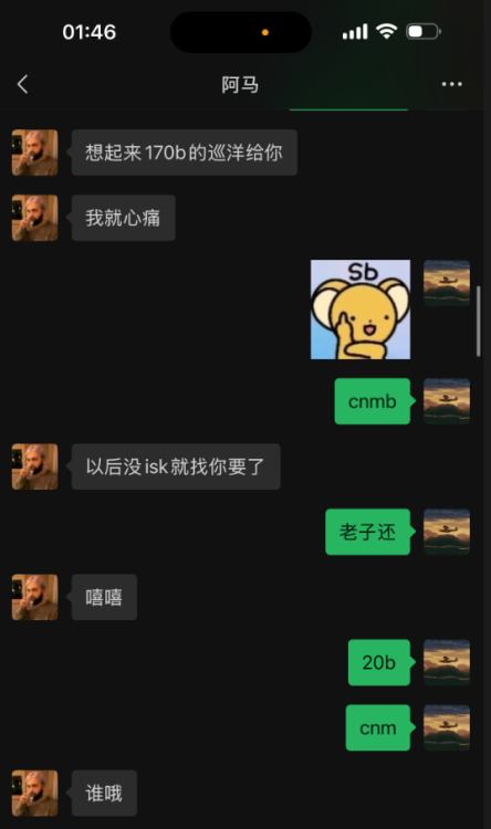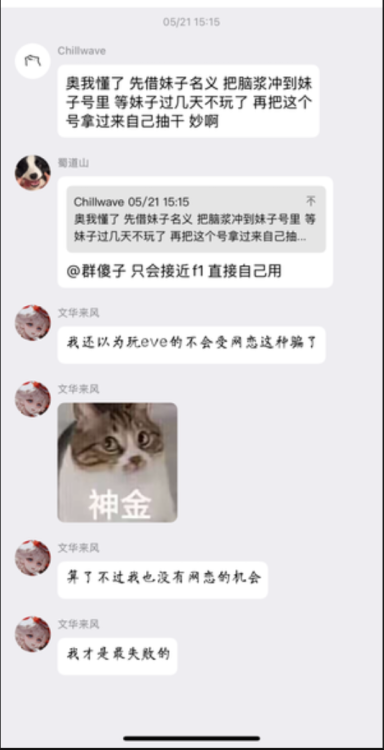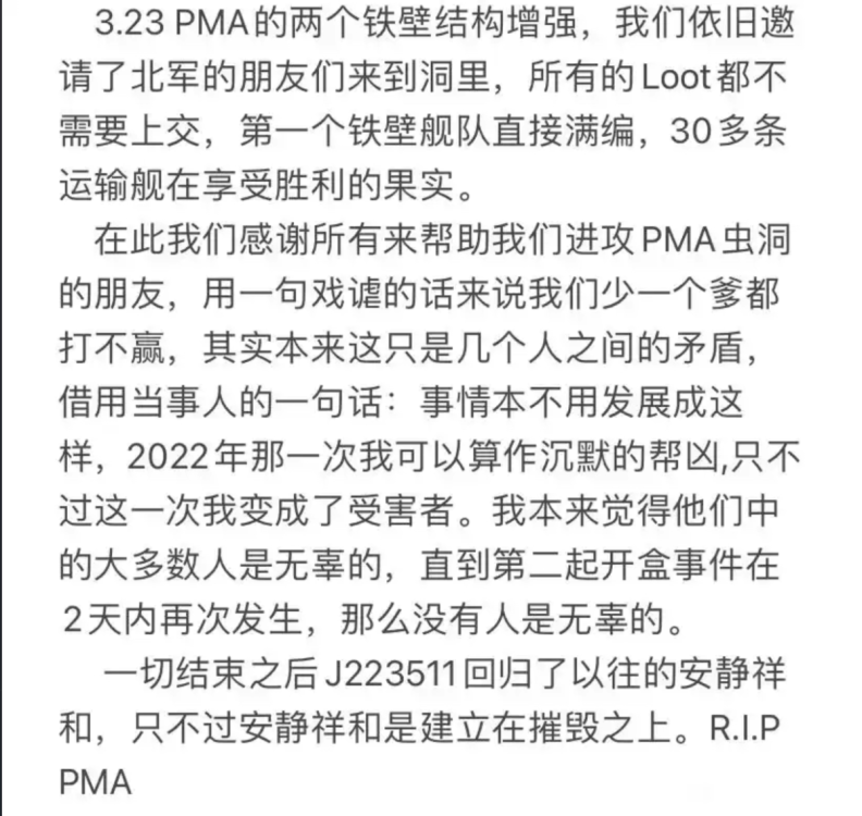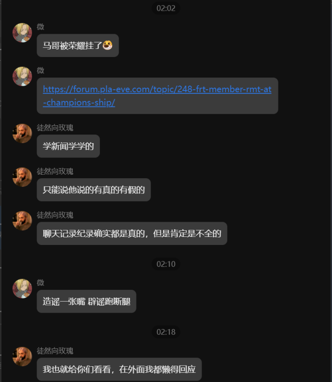 关于FRT联盟AT赛冠军成员RMT全过程的梳理 帝国新闻社独家专访RMT中间人Nan Li Leo 帝国新闻社记者:极端荣耀-欧服EVE初代网红,新伊甸顶流,全宇宙交际花,文能妙笔成稿,武能跪舔领导!从OSY到底特,到欧莎,到寂静谷无人不知无人不晓,FRT新人的噩梦,鱼儿子的击杀者,被盘古联盟和FRT联盟都踢过的CEO,新伊甸最牛逼军团的CEO,DRAGON FLEET龙舰队创始人,蜜蜂CN的吉祥物,开船不上船插的傻逼,黑隐用衍生钢板的穷逼,解铆堡垒被偷7堡退群独自疗伤的菜逼,FRT指挥女朋友七宝的舔狗,49过门全是蓝的泽尼塔驾驶员,被长枪过的帝国运输公司专业方舟驾驶员,现任蜜蜂联盟公司招募副总监,伊梅瑟亚的王,帝国新闻社社长,PLA军团的小透明,安静的美男子。 一、RMT人物梳理 1,RMT中间人也是爆料人:Nan Li Leo ,所属军团是Polaris Mercenary Alliance 的Thunder Mercenary Army,此次RMT交易,中间人只是作为朋友前线搭桥,从中没有收取任何的费用。 2,AT船卖家:Casimir Exusiai ,就是后面微信截图中的阿马,其他账号 Casimir Skyfire ,Casimir Platinum, call me Senorita ,thunder pony ,此人在FRT的主人物是Leon 7ovol(据说他创建了redamancy这家军团) 3,AT船买家:Li BaoBao ,就是后面微信截图中的RIGHT LEE,后面简称李宝宝,所属军团是FRT的Thunders Claw Fleet 4,AT船交易标的:3艘Cybele 5,成交价格:3500+10500=14000元 6,卖家与中间人聊天记录 7,买家与中间人聊天记录 下图是其他AT赛成员也在找渠道出售AT船的佐证 8,被爆料后阿马的回应,好吃,是RMT好吃吗 二、爆料背景原因 1.由于阿马是PMA母洞位标创建人,直接埋入扫描号,与斑鸠进攻了PMA母洞并推掉。下面引入一些从贴吧以及KB网获取的图片信息。 (1)2025年3月15日到3月18日的作战部署 (2)2025年3月19日到20日的作战部署 (3)2025年3月21日北京时间晚上发生了第一场比较大的战斗,是铁壁装甲增强,FRT为代表的进攻方损失680亿,以PMA为代表的防守方损失2256亿。 https://br.evetools.org/related/31000746/202503211400。 (4)2025年3月23日发生了第二次大型战斗,铁壁结构增强,FRT为代表的进攻方损失19亿,以PMA为代表的防守方损失528亿。 https://br.evetools.org/related/31000746/202503231800 2.在2022年3月份那时候阿马与斑鸠还有Nan Li Leo和其他两位PMA成员在线下面基,Nan Li Leo还请了阿马没吃过的帝王蟹一顿。一起住电竞酒店玩EVE,都是Nan Li Leo请客。到最后阿马背后给Nan Li Leo来一刀,带着FRT来推PMA的母洞,这就是Nan Li Leo作为RMT中间人要爆料FRT成员阿马RMT AT船的主要原因。 3.阿马在夺冠后,在一次洞外作战时,作为指挥官,在与DC作战时,因为一位PMA成员的作战失误被击杀后,阿马作为指挥官 直接开喷该成员太菜,并且抛弃场上其他队友直接跳走下线。其实当时后面还有10人左右在等待阿马的命令的成员。准备随时进场。结果自己跳走下线了。Nan Li Leo 叫后面的成员进场后去救队友已经来不及了,另外一位队友已经被击杀。之后Nan Li Leo并与阿马产生了争吵,大概内容就是:Nan Li Leo说阿马夺冠后觉得PMA成员菜可以,但是身为指挥官不能抛弃队友直接下线。要是觉得PMA的成员配不上他,他可以自己离开。 之后阿马离开了PMA母洞。并进入了斑鸠的F1母洞。 4.阿马在23年底,通过微信电话向PMA一位成员兜售2T isk. 让人怀疑其他AT赛冠军已经卖掉了AT船并想出售isk,这个只能是猜测,没有证据支撑。下面附上当时AT赛冠军成员名单: 三、关于Casimir Exusiai零价格挂给Nan Li Leo一艘Cybele 的说明 Nan Li Leo向Casimir Exusiai支付了170B和50个脑浆,购买了这艘Cybele,本交易不涉嫌RMT。后面截图可以说明这件事,阿马在抱怨200B的船170B就卖给了Nan Li Leo。所以看似零价合同,其实是已经付过170B ISK。 四 、关于Nan Li Leo盒阿马。实际上阿马的信息都是阿马为了向Nan Li Leo付钱1000元买雪茄发地址给Nan Li Leo,Nan Li Leo找卖雪茄的寄了雪茄给阿马,所以Nan Li Leo知道阿马的地址。阿马删除了Nan Li Leo 的微信,但是Nan Li Leo微信聊天记录还是在的。 从PMA洞内作战时的本地截图,可以看到Nan Li Leo的小号yakumo aka在本地发出了阿马的地址姓名和电话,本记者认为这是极为不妥的,游戏是游戏,现实是现实,游戏不牵扯现实,这是最基本的底线,并对此事对爆料人进行了强烈谴责,爆料人Nan Li Leo也承认了错误,他也觉得确实这样做是不对的。 五、请大家远离RMT 联盟FRT,FRT N老板之前就因为RMT被永封,只能藏在某小号后面,偷偷指挥。蜜蜂联盟欢迎所有愿意正常玩游戏的玩家加入蜜蜂联盟,如果您的军团有意向加入蜜蜂联盟,请联系极端荣耀QQ 12044225 咨询加联盟事宜。