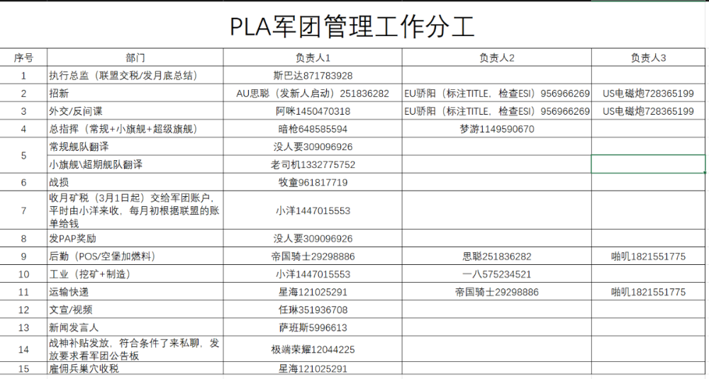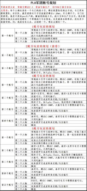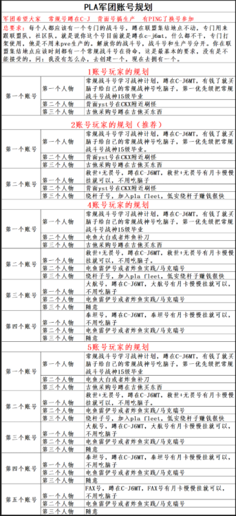 指挥官体系 =常规指挥= A1.初级指挥(反收割指挥官、兴趣小组指挥官) ▪️职责:组织军团境内反收割活动、外出收割活动等 ▪️权限:允许调动军团全部快反建制(军团反收割以及收割编制) A2.中级指挥(军团舰队指挥) ▪️职责:统帅PLA军团舰队 ▪️权限:允许调动军团建制以及部分社区舰队 A3.高级指挥(社区舰队指挥) ▪️职责:统帅帝国华人社区舰队 ▪️权限:允许调动帝国以及社区特有的全部常规建制舰队 =旗舰指挥= B1.小旗舰FC ▪️职责:统帅PLA军团旗舰舰队 ▪️权限:允许调动军团的无畏,后勤航,航空母舰编制。 B2.超旗FC ▪️职位暂空,所有超级旗舰/泰坦的调动听从蜜蜂联盟超级旗舰指挥的通知 =特勤指挥= ▪️职责:执行侦查,突袭任务,提供情报支持 ▪️权限:允许调动超旗以下所有他需要的舰船 =总指挥= ▪️职责:对所有指挥提供支持,合理使用并调配所拥有资源,熟悉每个指挥官带队风格、战时合理安排指挥官及相应舰队 士官体系 E1.士官 ▪️职责:在战场中驾驶特种舰船完成对指挥官下达的特种任务,对指挥官提供其需要的士官支持。 E2.副官 ▪️职责:作为指挥官的左膀右臂,战场中对指挥官提供信息支持,并在舰队中担任某些职位辅助指挥官完成作战任务。 -------------------------------------------------------- 指挥官条例 1、加入指挥部群,接受任务 忠于军团 严禁泄露任何指挥部消息 2、上级指挥官可以向下兼容(即:高级指挥可以组织反收割、兴趣小组舰队等) 3、非指挥部特殊指令下级指挥官不得擅自调动任何高于自身权限的联盟舰队 4、指挥官是战场上的命令是第—优先级 5、指挥官需要接受意见和建议,切勿刚愎自用 6、长期AFK的指挥官可能会被降级或者移除 7、指挥官在起队后需及时上报指挥部,如:是否有可能需要增援 8、指挥官晋升经由军团总指挥批准 9、如遇紧急情况(如抓到敌对超旗、旗舰),中级指挥官调动小旗舰后需及时向指挥部阐述情况并说明是否可能需要联盟增援 10、初级指挥和中级需完成指挥部的训练任务:包含且不限于(建制船体系对抗、主权系列任务、反收割) 11、高等级指挥有优先指挥权。 军团收割以及反收割配置看: PLA FLEET