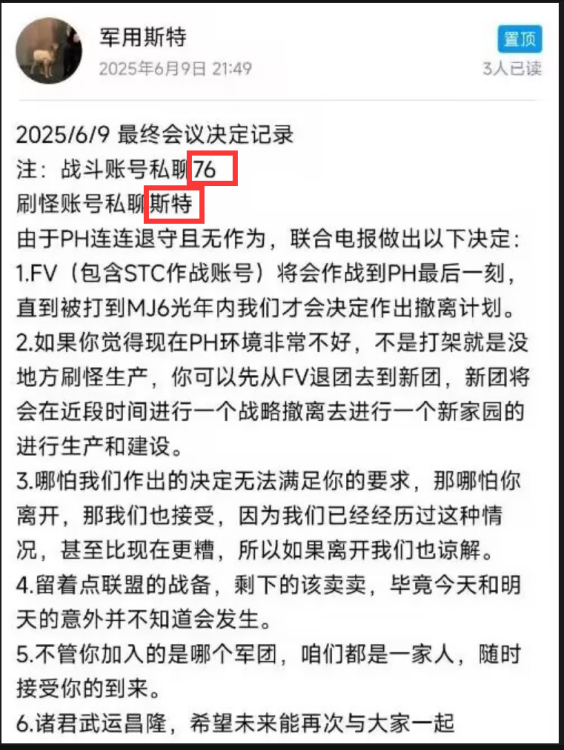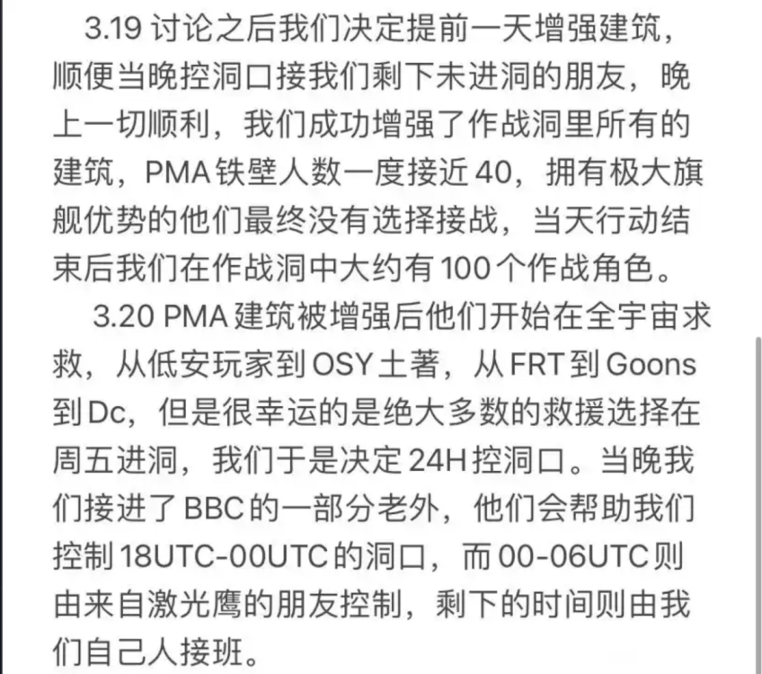 2025年2月28日军团会议纪要 一、军团管理与分工 1,管理团队分工已确定,各项事务请联系对应的管理人员。具体分工请查看:https://forum.pla-eve.com/topic/241-pla军团管理团队/ 2,ESI管理系统问题 由于CCP更新问题,军团ESI管理系统暂时无法提交新号/小号ESI。若有加小号需求,请联系军团招新官: 斯巴达(871783928) 骄阳(956966269)思聪(251836282) 二、战斗与战略部署 1,与宇宙魔药(COPO)的对抗,近期与COPO互蹲,暂无显著收获,需保持平常心,继续周旋。刷怪需求可转移至非塔波利斯和特里菲斯新地盘。 2,CKX战备保持不动 3,提升PVP积极性 听从指挥命令,积极参加联盟队,尤其是战略OP。提升PVP水平,避免消极行为。 4,反收割需求,需要以下驾驶员:加成(C/M,信息/护盾/游击专业V) 特种(拉克/修津 专业V) 后勤(专业V) 重拦驾驶员 技能方案已更新至军团方案。 5,舰队暴风队调整,根据建制舰队暴风队经验,后勤舰更换为曲剑,后勤舰飞行员请尽快更新技能。 6,战备补充,提前补充战备,避免临阵磨枪。 三、成员行为与规定 遵守军团规定,避免不当言行,否则可能被军团优化。详细规定请查看:https://forum.pla-eve.com/topic/15-pla-军团规定/ 四、SRP补损与悬赏 1,移动观测站和小绿人联盟境内的单浪补损已纳入军团SRP。 2,对敌对小黑/蹲子发布悬赏。 注意:移动观测站需用小号摧毁后执行SRP补损。 3,详细补损规则看:https://forum.pla-eve.com/topic/214-pla-srp/ 五、游戏与沟通习惯 养成上游戏和上KOOK的习惯,避免赛博自闭症。及时开麦回复FC询问,传递准确情报。 六、集结通知 注意集结通知群信息和公告。 七、技能与战备要求 1,常规号战神计划是每位成员必须完成的任务。常规战斗号和无畏小号是你在PLA军团立足的基础。拒绝挂技能、不买战备或长期无技能进步的成员将被清理。 详细计划请查看游戏内军团公告板或者这个帖子:https://forum.pla-eve.com/topic/242-pla军团战神计划/ 月矿规则 八、月矿详细规则请查看:https://forum.pla-eve.com/topic/243-pla军团月矿规则/ 九、招募与福利 1,招募实习FC与士官,军团正在招募实习FC与士官,有兴趣者可联系军团总指挥暗枪(648585594)。PLA军团指挥官体系:https://forum.pla-eve.com/topic/244-pla军团指挥官以及士官体系/ 2,实习FC与士官将获得额外福利。指挥官体系与积分奖励实施方案请查看:https://forum.pla-eve.com/topic/245-pla军团指挥官和士官积分奖励实施方案/ 十、社区与活动参与 1,积极参加社区队/反收割。 2,战斗号需在CKX准备远程克隆体。 请各位成员认真阅读并遵守以上通知,积极参与军团活动,共同提升PLA军团的战斗力!