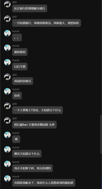 帝国新闻社2025年3月28日新闻 FRT联盟第二大成员军团Stardust-Guardian爆出惊天大瓜 SGCN开办的军团银行被封! 一、军团银行被封事件:Stardust-Guardian军团折纸之前在军团内开办银行,团员把ISK存在军团的银行拿取利息,日前折纸开办的军团银行的账号被CCP封号,账号被封的原因是前几天CCP出的季卡活动有买了季卡不扣黄币的BUG,折纸利用这个BUG给自己买了4单!第二天账号就被封了,目前不知道军团银行账号是否可以解封,不知道被封总资金量有多少,所有ISK不知道是否可以归还团员。 二、从爆出的聊天记录可以看出,折纸与军团CEO冰轩之前就因为是否开办军团银行有分歧,现在明显已经产生矛盾,折纸表示要带走SGCN的军团成员,并且表示如果账号无法解封,就使用氪金或者去淘宝闲鱼买ISK偿还军团成员的存款。可以看出SGCN分裂在即。帝国新闻社对此事高度关注并会进行跟踪报道。如果折纸打算带成员组建军团加入蜜蜂联盟,我们将会提供协助! 下面聊天记录的冰轩是CEO,Astelir是军团银行的开办人折纸。 下面是对当事人折纸进行的采访: