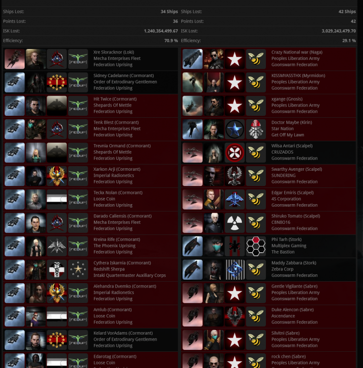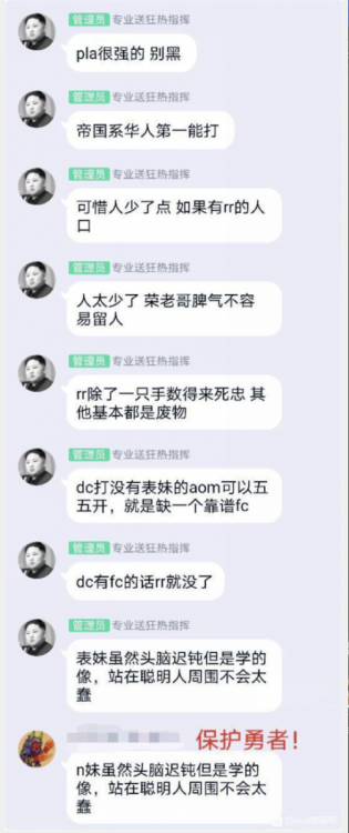 7月28日,星期二 1,今天上午8点45,蜜蜂开始组队,解铆3-FK星城,蜜蜂组队651,https://dscan.info/v/94bb86794b7b,先是渎圣队进场,然后在3-FK本地上线了3个反诱导,然后大航,泰坦,FAX,小航母,无畏全进蹲在星城上。反诱导上线以后,星城解除了铆钉,蜜蜂14个货舰跃迁星城进行拾取,这时BRAVE的货舰也跃迁了进来,当然他变成了KB,https://zkillboard.com/kill/85953170/。蜜蜂货舰拾取星城完毕,泰坦开桥去了W6V,泰坦大航小旗舰陆续离场。今天星城的成功解除铆钉与4天前IHUB防守必不可分,我们PLA立下了汗马功劳。 2,插播一个贴吧看到的聊天记录,N老板对帝国系华人公司的评价 3,面对10几个TCU TIMER,无心绕点,随他们去吧。