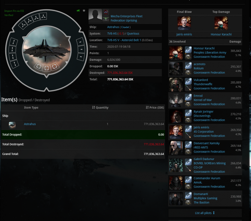 7月23日,星期四 1, 上午11点,Federation Uprising又来增强TV8 TCU,我们果断出散打船开始迎战,结果敌人开了一个亥伯龙神过来,我们果断换上7个刷怪多米迎战,成功击杀对方一个洛基和一个幽灵,https://zkillboard.com/related/30003958/202007230500/,于是我们顺势把TV8 IHUB绕进增强。 2,今天敌人很疯狂,下午5点,Evictus. 30+寒鸦队强行开始绕ED-L9T和9SBB ihub,同时Caladrius Alliance8+奥苏斯队开始绕60M,Stellae Renascitur同时开始绕A3-LOG O3L A2-V27,3点同时开花,我们果断喊了联盟队对付Evictus.,然后军团组队打跑了小日本的对60M的企图,因为小日本的奥苏斯比较猥琐,所以没有什么KB发生,并且分了部分散打船去T8H附近打跑了SR,SR更是猥琐至极,他就1个人,不跟你正面打,只是猥琐偷点,但是他也没有成功。 3, ED-L9T战报:https://zkillboard.com/related/30004020/202007230900/ 4,今天是战争第19天,今天被绕点19次,自从战争开始以来合计被绕点295次。 5,值得注意的是,Federation Uprising在TV8下了新的堡垒,我们已经做了TIMER登记,待它上线的时候打掉,同时Federation Uprising还在TV8下了2个小POS,看来他们打算安家在这里做长期斗争。包括POS也会被打掉。 6,更可怕的是,TEST在EFA下了铁壁,上线的时间恰恰就是3-FK IHUB出增强的半小时前!周五的下午2点半必有一场大战!果然FRT也提前进行了预告。 7,我们还发现了THMFA在W6V转给BRAVE的莱塔卢,也打进了增强。