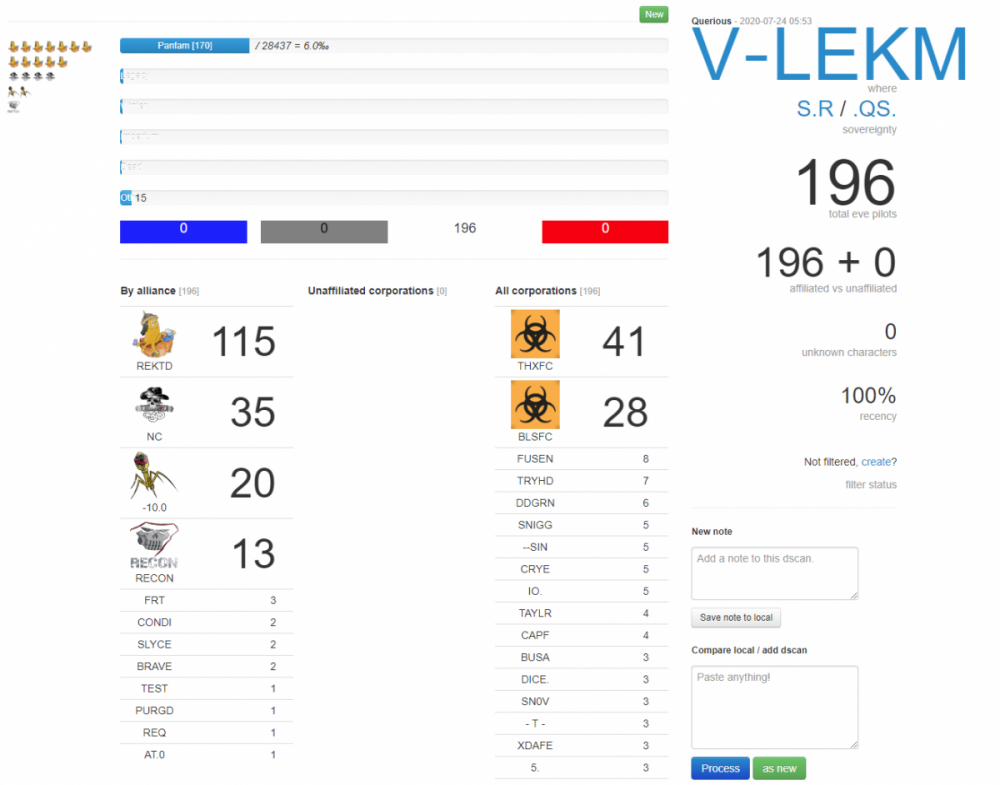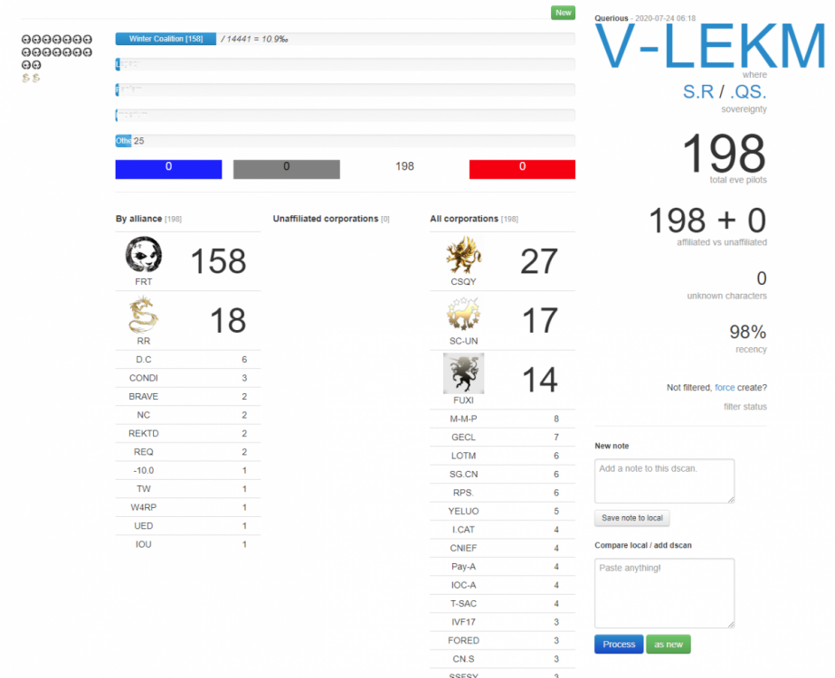 7月24日,星期五 1,蜜蜂在中午13点,起了渎圣队和万王队和小旗舰队,渎圣队190,万王队70,小旗舰数量未知。但是面对敌人接近800人,我们只能在W6V蹲站和刷怪。我们面对敌军800人,我们认为我们无法打掉TEST在EFA的刚刚上线的铁壁,也不认为可以守得住3-FK IHUB。 2,LEGACY杂牌小弟193人银鹰队,https://adashboard.info/intel/local/view/tPUKzRSC ,https://adashboard.info/intel/dscan/view/hzNxm7Wf 3,TEST 173 缪宁队,https://adashboard.info/intel/dscan/view/fKXWMQii 4,FRT 198 缪宁队,https://adashboard.info/intel/local/view/gHGjLm2x ,舰队组成https://adashboard.info/intel/dscan/view/gUg5WloE 这里面包括了18个RR的,RR组了战鹰队,我们愉快的开玩笑,RR真的不是来组队打深渊的嘛 5,PH,PL,NC 198缪宁队https://adashboard.info/intel/local/view/P3MPrPIW 6,联军762人堵着门开始逑瑞斯全境绕点,DISCORD和QQ群开始弹疯狂绕点的信息,我们躺平了给他们绕。他们很疯狂,把逑瑞斯绕增强了23个IHUB。 7,时间到了下午15:00,3-FK IHUB出增强的时候到了,搞笑的事情出现了!种种迹象表明,4个敌人的大舰队开始纷纷撤离,我们分析是因为已经是美东的后半夜3点,如果想绕爆3-FK IHUB,他们至少还需要绕9个50分钟的节点,他们的FC受不了了,全部撤离。联盟渎圣队和万王队投送进3-FK 堵着EFA门,我们用最短的时间把3-FK的IHUB进行了绕点恢复,并且马上安装了跳桥模块,开通了9CG6~~3-FK的跳桥。老外们离开情有可原,可是FRT为什么离开啊?我猜是不想被暴打!~今天没有能够打掉TEST在EFA的铁壁,但是我们守住了3-FK的IHUB,这可以有助于3-FK星城的解铆钉,为3-FK 星城解铆打下了坚实的基础。在战争进行到第20天,我认为PLA和UED的存在已经超额的完成了战争任务,拖慢了敌人的脚步。早上看KB,TV8敌人的小堡垒也没打掉,在接下来的时间,他们在逑瑞斯有立足点,我们将会比较难守60M口袋。 8,下午我们还对YOP和0TKF的TCU IHUB进行了修复。 9,今天是战争第20天,今天被绕点35次,自从战争开始以来合计被绕点330次。