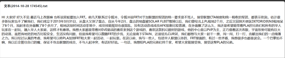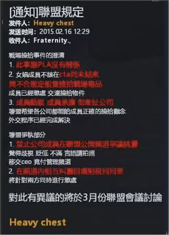 The Mittani 在Fire side chat中关于对PLA军团的评价 2020年2月15日 https://wiki.goonswarm.org/w/Fireside_Chat_Transcript_15_Feb_2k20 The Mittani 谈论到PIBC, FRT时提及PLA军团 pibc is basically the chinese version of the imperium they won their equivalent of the great war on serenity on serenity and uh the losers of the chinese version of the great war uh and i could be mangling this guys like i'm not completely 100 on my history of everything that happened in serenity but basically the pibc guys are kind of like us from the chinese server and the fraternity guys are kind of like band of brothers from uh the chinese server uh so they were the losers of frt with losers of the serenity great war uh pibc were the winners and we have basically been living with one of the largest groups of pibc affiliated chinese players here within goons form for like the last five fucking years uh because uh the pla corp which is this vast and awesome chinese member corp of ours and goons form uh are part of that crew uh and so that sort of extends out to like ranger regiment and the various other pibc uh tranquility groups so uh it has been kind of funny to see the nc. guys sort of siding with frt and posting all these really shitty racist memes uh if the imperium has an alignment the imperium uh is much more on the uh pibc side because uh pla is an awesome corp they're run extremely well we don't have any of the problems that people have had with like botting or bullshit or anything like that because uh silvitni runs a really tight ship and uh so we know that uh yeah so that's that's basically where we stand on the whole pibc frt thing good question uh will the fc championship be back one day uh possibly right. 中文翻译 pibc基本上是中国版的帝国,他们赢得了相当于宁静之战的胜利,嗯,中国版的大战的失败者,嗯,我可能会把这些家伙搞得一团糟,就像我对宁静中发生的一切的历史还不完全了解一样,但基本上pibc的家伙有点像我们,来自中国服务器,兄弟会的家伙是有点像来自中国服务器的兄弟乐队,他们是失败者,frt是宁静大战的失败者,pibc是胜利者,在过去的五年里,我们基本上一直与pibc旗下最大的中国玩家群体之一生活在一起,因为pla corp,这是一个庞大而令人敬畏的中国成员团体,嗯,是团队的一部分,嗯,这有点延伸到了游骑兵团和其他各种各样的pibc,嗯,宁静团体,所以,看到nc,伙计们站在frt一边,发布所有这些非常糟糕的种族主义,嗯,如果帝国有一个联盟,那么帝国就更多地站在了pibc一边,因为,pla是一个很棒的公司他们运行的非常好,我们没有任何问题,就像人们遇到的一样,比如脚本、狗屎诸如此类的事情,因为sivlitni的管理非常严格,所以我们知道,嗯,是的,这基本上就是我们对整个pibc的立场。