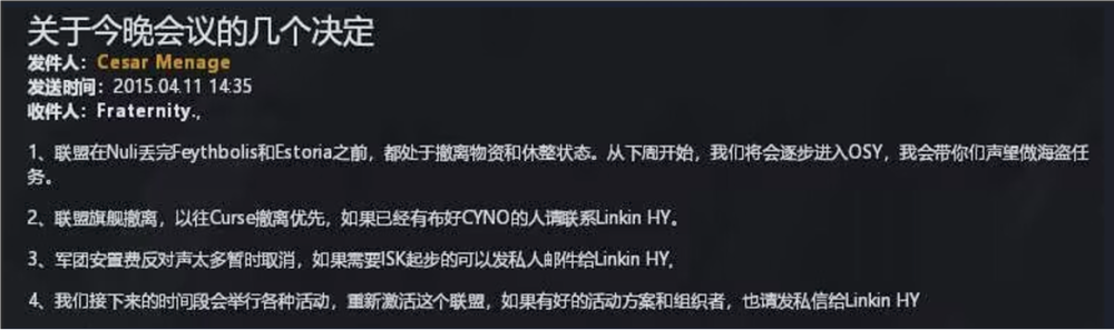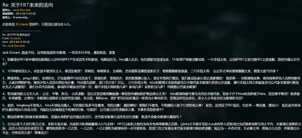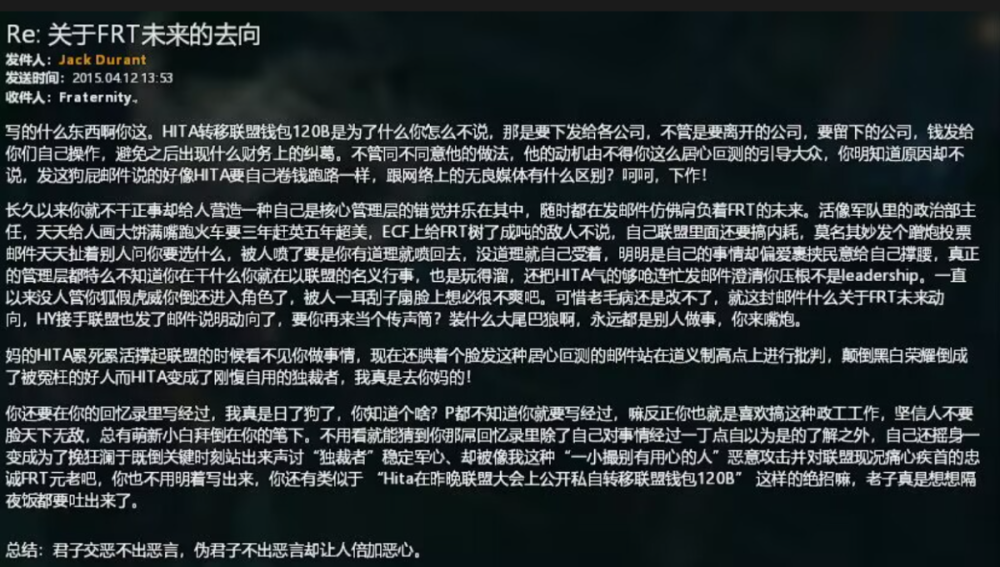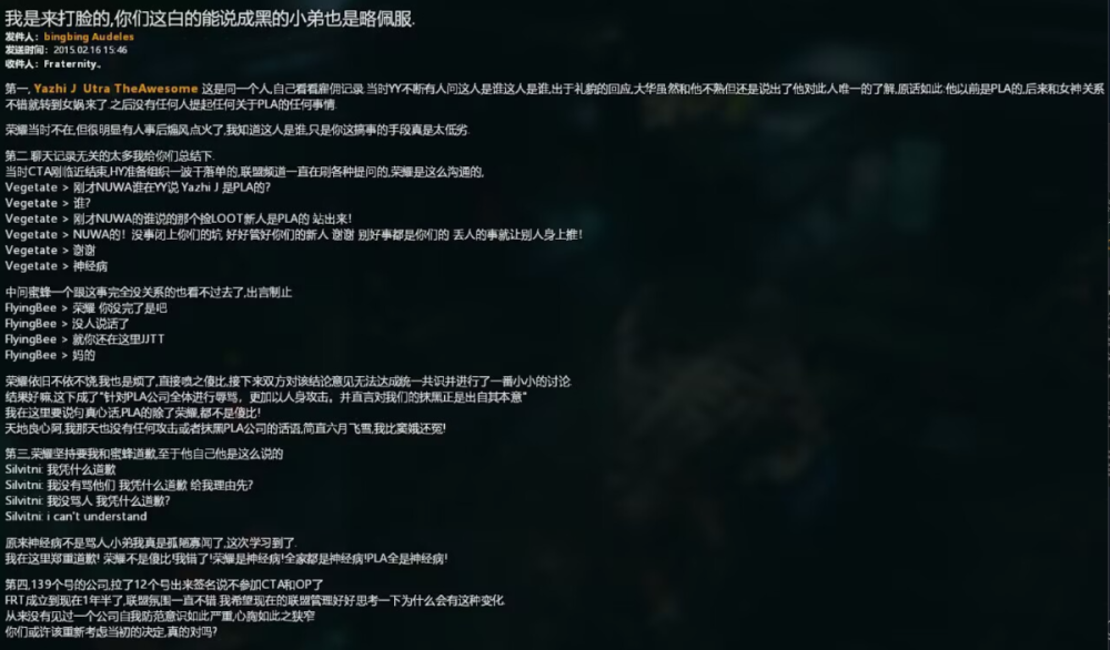 2020年8月2日 https://wiki.goonswarm.org/w/Fireside_Chat_Transcript_2_Aug_2k20 在PLA军团使用UED联盟,经历过Querious保卫战之后,The Mittani对PLA军团做出的评价。 Similarly, I want to, I talked about this on the Meta Show, but I want to give a shout out in front of all of you guys too.PLA and Silvitni and his crew with the United Earth Directorate Alt Alliance.That was a project that he initiated. He basically came to us and said, "We're going to have this Alt Alliance and we're going to hold the line in North Quarious."And my reaction was basically, "I don't think you can do this, but if you want to try, good luck, because Northern Quarious is just too far out."And what actually happened was up until just a few days ago, they required an entire legacy form up on a weekend to be able to roll through those IHUBS.And again, Fountain was held a lot longer than expected. North Quarious was held for a lot longer than expected.So credit to the initiative, credit to PLA, Silvitni and the United Earth Directorate. That was really fucking cool. I did not realize they could do that. 中文翻译 同样,我想,我在Meta Show上谈到了这一点,但我也想在你们所有人面前大喊一声。PLA和Silvitni以及他的成员与UED联盟。这是他发起的一个项目。他基本上走到我们面前说:“我们将组建这个马甲联盟,我们将在北Querious坚守阵地。”我的反应基本上是,“我认为你做不到,但如果你想尝试,祝你好运,因为北Querious太远了。”而实际发生的事情直到几天前,他们使整个LEGACY组队用了整整一个周末才将求瑞思的IHUB进行了增强。再说一遍,源泉防守的时间比预期的要长得多。北Querious被关押的时间比预期的要长得多。因此,这要归功于归功于PLA、silvitni和UED联盟的兄弟们。真的太他妈酷了。我没有意识到他们能做到这一点。