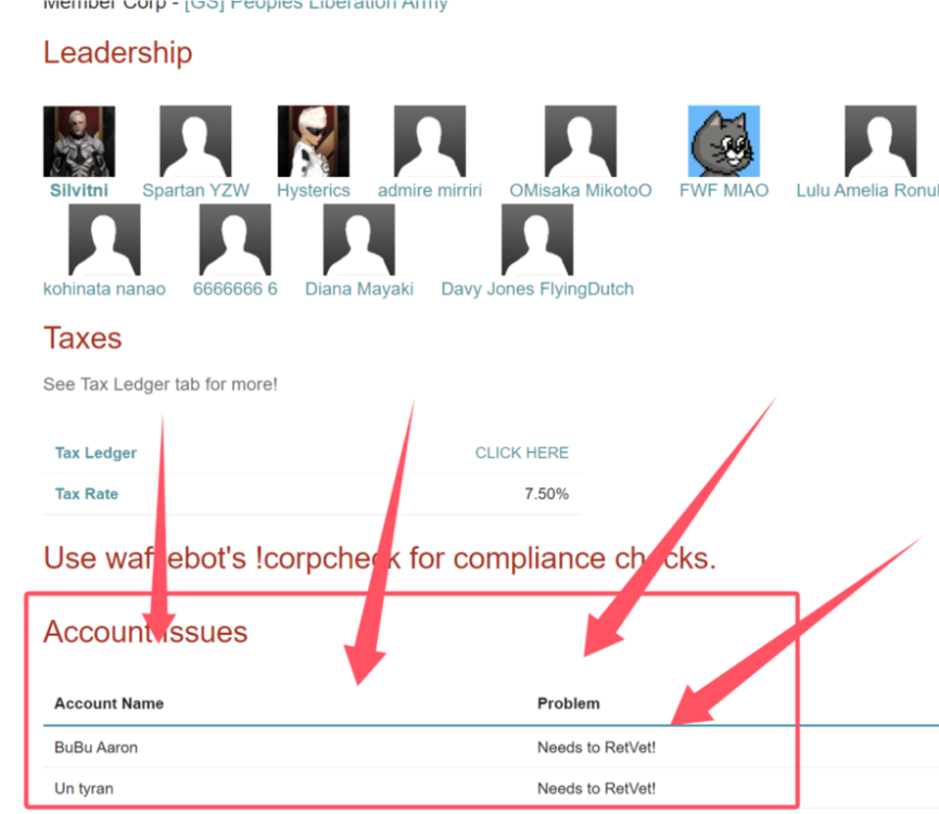 首先欢迎您带领您的军团加入GOONS 一、 用你的CEO号注册蜜蜂论坛,网址是:https://forum.pla-eve.com/topic/31-蜜蜂联盟论坛注册-gsf-forum-registration/ PS:如果你以前在其他势力提交过ESI,可以从以下网址取消ESI认证:https://community.eveonline.com/support/third-party-applications/ 二、确保你所有的人物的ESI在这个网址:https://esi.goonfleet.com/Manage/Characters 三、登记你所有的公司ESI在这个网址:https://esi.goonfleet.com/Manage/Corporations 四、 安装并且设置好你的JABBER:https://forum.pla-eve.com/topic/38-蜜蜂联盟舰队通知软件-gsf-jabber(pidgin)/ 五、安装并且设置好你的MUMBLE:https://forum.pla-eve.com/topic/42-蜜蜂联盟舰队语音软件-gsf-mumble/ 六、创建你军团的JABBER房间 1, 点击好友,选择加入聊天 2,输入你想要的名字,一般这个地方输入你的军团简称,拿Wind Guardians军团举例子,他的军团名字是Wind Guardians,军团简称是W.GU,所以在聊天室的那里输入wgu,不要带标点符号,点击右下角加入。如下图 3, 加入的时候,他会弹出来一个窗口,问你要不要配置窗口,点击配置窗口。 4,勾选3个地方,第一个是list room in directory,第二个是ROOM IS PERSISTENT,第三个是 ROLE THAT MAY DISCOVER REAL JIDS OF OCCUPANTS 选择ANYONE,然后点击确定。 5,房间就创建好了,你会发现你的名字旁边有一个小旗子,当你创建好以后,请把你的房间名字告诉极端荣耀QQ 12044225,荣耀会帮你联系蜜蜂IT管理员加一个机器人。同时你也可以通知你的团员们加入这个房间了! 七、 关于交税,蜜蜂联盟收7.5%的TAX,你最低设置的税率是7.5%,不能低于7.5%,你可以设置高于7.5%的任何税率,一般来说,军团都会设置在10%-15%。蜜蜂的论坛每天会根据你军团的刷怪数据产生每天的税收,数据在https://esi.goonfleet.com/ 可以查看,比如下图。 你点击上面的那个军团的图标那里,你可以打开你的税收的明细,就跟充值系统一样,你交税的时候需要从你的军团账号打钱给Goonbine Honnete Ober Advancer Mercantiles这个军团,他就会充值进你的公司账户,并且每天扣一点。你的账户是负数的时间不能超过30天。 八、仔细阅读所有的联盟规定:https://goonfleet.com/index.php/forum/323-chinese-goonswarm-小蜜蜂中文專區/ 九、检查你军团成员的ESI注册情况和蜜蜂账号是否正常是CEO和总监每天都要做的日常工作。 1,第一个是检查新加军团的成员有没有注册ESI,方法是在你的CORP JABBER ROOM里面输入指令!corpcheck,机器人会弹出来窗口,告诉你哪些角色没有注册ESI,那么你就需要去通知那个成员去登记ESI或者注册蜜蜂的论坛。比如下图就是有一个没有注册ESI的。 2, 第二个是要检查所有在你军团里面的成员的蜜蜂论坛的组是否正常,比如他一开始注册了蜜蜂论坛,后来他退军团了,后来又回来了,这时候他加回来以后,他就需要去重置蜜蜂的论坛组,教程是https://forum.pla-eve.com/topic/34-蜜蜂联盟论坛重置密码-gsf-forum-reset-password/,让他按照这个教程去重置组。那么怎么发现都有谁需要做这件事呢?去看这个网址,https://manager.goonfleet.com/,找到你的军团的名字,点击进去,比如下图。 点击进去以后,在ACCOUNT ISSUES的地方,如果有名字,就是说明他们有问题,账户需要重置,就把重置的教程丢给他,让他去重置蜜蜂论坛。注意,每一个加过军团,注册过蜜蜂论坛,退出军团后,又加回来的,都需要重置组,否则他们都会出现在这里。 十、 如果你的成员回归以后,邮件也忘了,密码也忘了,需要重置论坛的邮件,那么去这个网址去找管理员,每改一个注册的电子邮件需要支付500M,https://goonfleet.com/index.php/topic/365635-recovering-accounts-with-lost-emails/?hl=lost 十一、JABBER房间可以常用的命令,在你自己公司的JABBER频道 你可以输入以下指令 去查数据以及修改房间的设置 /config 配置JABBER房间 !corpcheck 检查PLA军团在GSF论坛的ESI授权情况 !toppap 当月出勤前20名排名情况 !toprat 当月刷怪前20名排名情况 十二、蜜蜂的军团的总监的JABBER频道是kremlin,如果你是CEO或者总监,在线的时候需要挂着JABBER并且进入这个房间。 十三、军团CEO或者总监可以通过以下网址给军团成员发送JABBER的广播:https://esi.goonfleet.com/broadcast 十四、查询帝国黑名单的网址:https://esi.goonfleet.com/blacklist 十五、如何给自己的军团队伍发PAP。 1,发pap需要加入小组:https://esi.goonfleet.com/Group/1435, 2,发pap网站:https://fleets.gnf.lt/fleet/start,发军团PAP的时候选择CORP,后面选择TRACK,发的时候点击CLOSE,并且确定,PAP就发放完毕了。 十六、蜜蜂中文社区的介绍:https://forum.pla-eve.com/topic/235-蜜蜂中文社区/ 十七、蜜蜂每月军团出勤考核的指南:https://forum.pla-eve.com/topic/247-蜜蜂每月出勤pap指标指南/