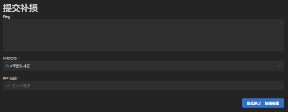 军团补损网站使用说明 首先进入军团补损网站 https://srp.pla-eve.com/srp/my 使用军团论坛用户名及密码进行登录 点击补损金额可以查询具体补损标准 点击提交补损进行补损申请 需要舰队通知的补损申请在Ping部分粘贴舰队通知。 不需要舰队通知的补损申请,请注明军团驻地反收割,新人狂怒或其他相关信息。 KM链接可使用ESI链接或zkill链接。 补损类型不需要更改。 然后猛击“我吃屎了”提交补损申请。 点击我的提交可以查看补损记录。 我的提交可同时查看补损状态,处理人及备注信息。如有疑问请联系处理人。