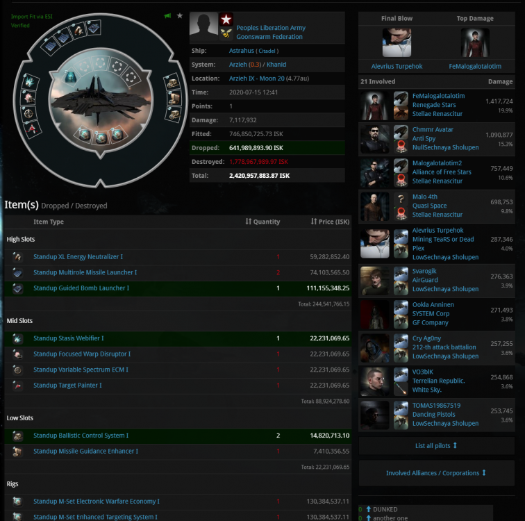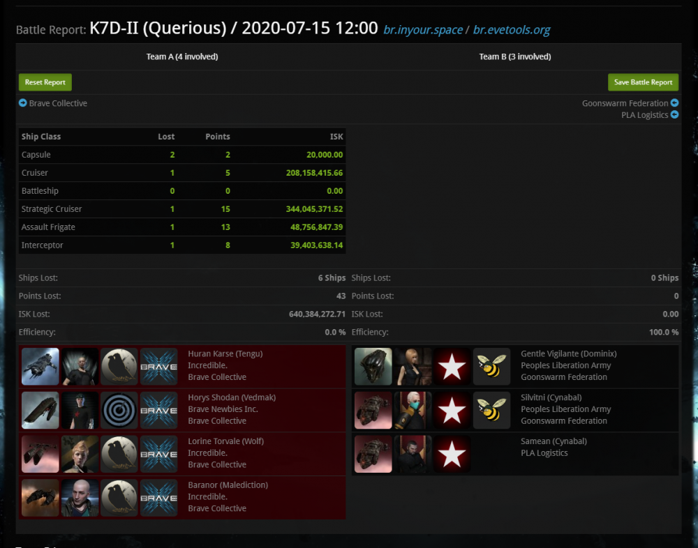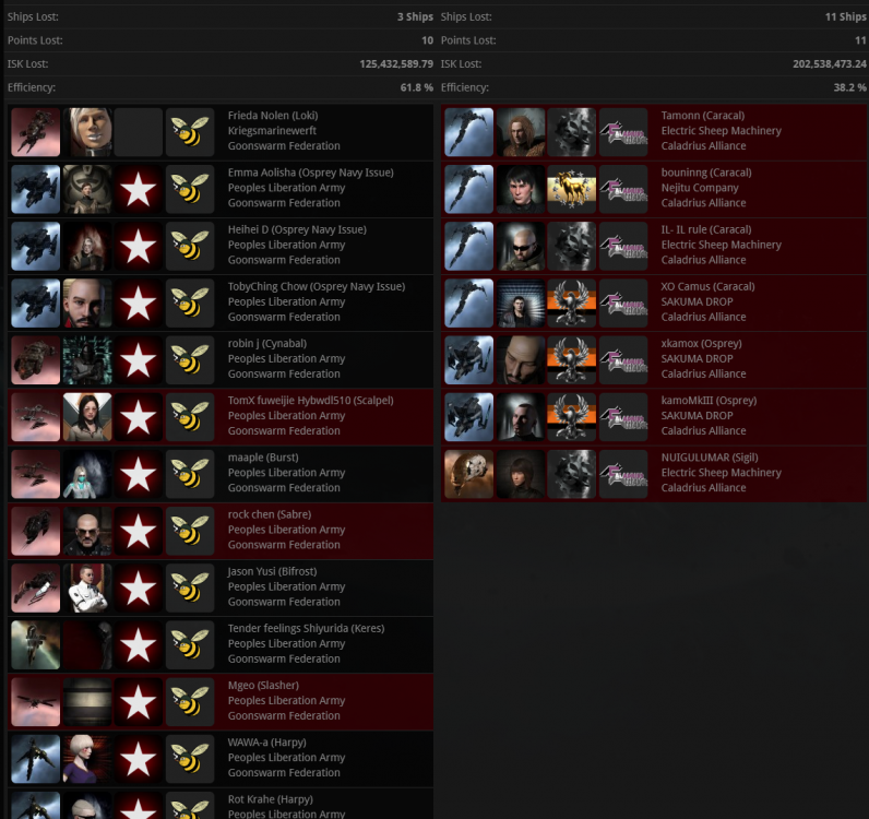 7月15日,星期三 1,早上10点半,Federation Uprising 制式40+寒鸦队来60M口袋,将TV8的IHUB绕爆之后离开,我快速的在TV8扔了新的IHUB并且重新上线,这是逑瑞斯丢的第2个IHUB。我们对其他出增强的TCU IHUB都进行了恢复。 2,下午5点可被攻击的窗口期,FRT又预谋攻击3-FK IHUB,做第二次尝试,3-FK爆发大战,TEST来了缪宁队,FRT是缪宁队,联军缪宁达到180条,而蜜蜂缪宁只有90。蜜蜂调动无畏和航母果断迎战,帝国系317人对战联军277人,帝国损失138亿,联军损失155亿,联军又一次失败了!https://zkillboard.com/related/30004019/202007150900/ 3,今天是战争第11天,今天被绕点11次,自从战争开始以来合计被绕点185次。 4,晚上八点与brave爆发一个小队战,团灭对方TENGU和阿三船,https://zkillboard.com/related/30003950/202007151200/ 5,晚上8点40,无耻的SR喊了红螃蟹打了PLA在ARZIEH的物流空堡,https://zkillboard.com/kill/85623203/