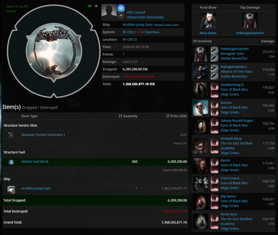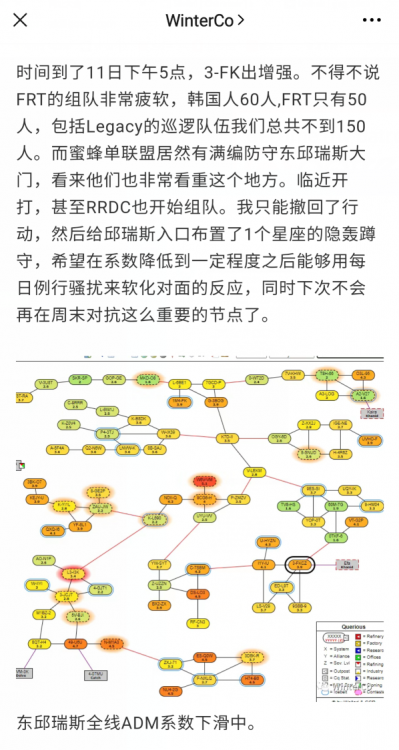 7月13日,星期一 1,因为A2-V27 ihub是重新下的,没有及时的刷ADM,0TKF由于TXG海神哥的长期蹲,导致周边ADM都很低,导致这2个星系的可攻击窗口变得很长,由于我又把可攻击时间提前了1小时,这就导致来了新的联盟Federation Uprising 带30+制式寒鸦队来绕点,敌人很疯狂,一次就绕增强了8个建筑。因为敌人是带制式舰队来的,我直接躺平了给他绕。 2,今天是战争第9天,今天被绕点17次,自从战争开始以来合计被绕点158次。 3,看了N老板写的战报,简直是一派胡言,他说逑瑞斯所有IHUB都被重置一遍,其实我们只丢过唯一的1个A2-V27这个IHUB并且马上恢复了,而且也没什么东西给韩国人和FRT什么无障碍拆迁,请问FRT拆什么了?韩国人也就是打了2个跳桥,仅此而已。